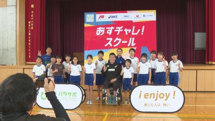 「あすチャレ!スクール」が今年度も市内の小中学校で開かれ、男子車いすバスケットボール元日本代表選手による講話などが行われました。あすチャレ!スクールは、パラアスリートを中心とした講師たちが伝えるリアルから、これからのより良い社会を創り出していくためのヒントや気づき、そして明日へのチャレンジのきっかけにしてもらおうと、日本財団パラスポーツサポートセンターが全国開催しています。先週木曜日は上郷小学校で開かれ、体育館に集まった5・6年生が講師の先生を拍手で迎えようとすると、まさかの後ろからの登場で児童たちを驚かせました。今回講師を務めた神保康広さんは、パラリンピック4大会出場の男子車いすバスケットボール元日本代表選手です。車いすと車いすが激しくぶつかり合うシーンも多く見られる車いすバスケットボールですが、神保さんは初めに、競技用車いすの特徴や乗り方について説明し、正しく乗ることで競技が安全に進められていることを児童たちに伝えました。続いて、神保さんは、車いすバスケットボールのルールについて説明し、ロングシュートを見事に決めると児童たちは大喜び、活気みなぎる中、車いすバスケットボールの体験も行われました。このあと、大人たちによるスペシャルマッチも行われ、ボール運びに手こずりながらもなんとか決めた1点に児童たちも大盛り上がり、車いすバスケットボールの楽しさや難しさを学んでいました。最後は、講話が行われ、大事なものを諦めてしまった過去や素直になれなかったことへの後悔、オートバイでの事故で歩けなくなった時に励まし応援してくれた友達の存在など、これまでの経験が伝えられました。神保さんは現在、「スポーツで世界を一つにしたい」を明日へのチャレンジとして、途上国や中進国でもパラスポーツの普及活動に取り組んでいます。さまざまな国での活動を通して神保さんが児童たちに贈ったアドバイスは行動することの大切さや楽しむことでした。なお、あすチャレ!スクールは、今週金曜日まで市内の小中学校で開かれています。
