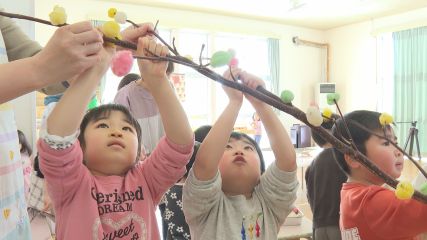 続いても小正月の話題です。松崎保育園では先週木曜日、園児たちがみずき飾りを体験しました。この行事は園児たちに地域の伝統文化に触れてもらおうと企画され、2歳から5歳までの園児が参加しました。この日は10年ほど前から園児たちに地域の伝統を伝えている「むかしかだりのたきばっちゃん」こと菊池タキさんが、みずきだんごを教えました。園児たちはたきばっちゃんに教えてもらいながら、赤や黄色、緑など色とりどりの団子を小さな手でていねいに丸めました。この後、地域の人から提供された「みずき」の枝に、一つひとつ大切に団子を飾り付けていきました。またみずき飾りが完成すると、たきばっちゃんがお正月にまつわる昔話を語り、園児たちは静かに耳を傾けていました。会の最後には華やかに彩られたみずき飾りを前に写真を撮り、ことし1年も元気に過ごそうと笑顔を見せていました。Copyright(C) TonoCableTelevision. All rights reserved.