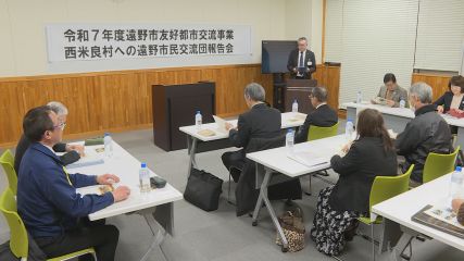 遠野市友好都市交流事業の報告会が、先週木曜日に市役所本庁舎で開かれました。報告会には多田市長や遠野市民交流団の団員6人などが参加しました。初めに市民交流団の小林立栄団長があいさつし、「このメンバーで友好都市の皆さんと交流を深められ楽しい時間を過ごすことができた。」と交流事業を振り返りました。市民交流団は11月7日から2泊3日の日程で宮崎県西米良村に行き、同じく友好都市の熊本県菊池市を入れた3市で交流を深めました。現地では西米良村の歴史・文化を学びつつ、ゆずの収穫体験やジビエ加工処理施設の見学、月の神楽の鑑賞などをしてきました。事業報告のあと団員が感想を発表し、西米良村に行って気づいたことや感動したこと、遠野市とのつながりを感じたことなどを話しました。このうち交流事業に初めて参加した及川真紀子さんは、西米良村の語り部たちと交流できたことがうれしかったそうです。会の最後には多田市長が「西米良の人たちは遠野に負けないくらい郷土愛が強かったですね。今後も交流をずっと続けていきましょう」と話し、さらなる交流・連携の強化に向けて決意を新たにした様子でした。