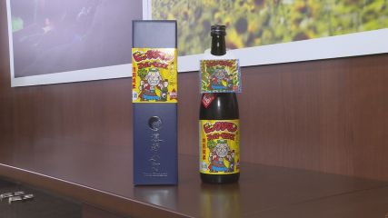 青笹町の上閉伊酒造が40年以上にわたって人気を集めるチョコレート菓子「ビックリマンチョコ」とコラボレーションした純米酒をあすから数量限定で販売します。きょうは上閉伊酒造の新里佳子代表取締役が市役所本庁舎を訪れ、多田市長にあすから販売が始まるコラボ商品について説明しました。このコラボは全国6社の酒類メーカーがビックリマンチョコを販売するロッテとタッグを組む企画「ビックリマン地方創生プロジェクト」の一環として実施されたものです。プロジェクト第3弾ではビックリマンの人気キャラクター「スーパーゼウス」が描かれた特別なパッケージの純米酒「遠野小町」が限定販売されます。シールやラベルをよく見ると、酒瓶を持ったスーパーゼウスの頭にはカッパのお皿が、杖にはホップの毬花があり、胸には遠野市公式キャラクターのカリンちゃんがあしらわれています。説明のあと新里代表から商品を受け取った多田市長は「遠野らしさが伝わるラベルデザインで、遠野を全国の人に知ってもらえるチャンスになりますね。」と話し、コラボ効果に期待を寄せていました。なお「遠野小町×スーパーゼウス」は、県内の店舗でのみ手に入る「地元エリア限定版」が500本、上閉伊酒造の通販サイトをはじめ広域で入手できる「全国限定版」が2,500本の数量限定で販売されます。販売はあすから始まり遠野市内ではスーパーや酒屋、道の駅などで購入することができます。
