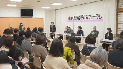 2026教育を創る遠野市民フォーラムが先週火曜日松崎町の総合福祉センターで開催されました。このフォーラムは、遠野市内の児童数が減少している中、市が小学校の在り方や教育活動について検討を進めていることから「どうすれば子どもたちが生き生きと学び成長していけるのか」を考えようと、岩手県教職員組合花北遠野支部遠野支会が開きました。この日は「学校再編にあたって大切にしたいもの」をテーマに市内小学校のPTAや地域住民7人によるパネリスト、学校教職員などおよそ50人が集まり意見を交わしました。フォーラムでは各パネリストがそれぞれの学校の特徴などを紹介したあと「学校を再編する場合現在の学校から引き継ぎたい良さ」について話し合われました。参加者からは遠野の自然や地域の人と関わりながら学ぶ学習や神楽・しし踊りなど各小学校が行っている特色ある授業を残していってほしいといった意見が寄せられました。続いて、「学校再編で新たに期待したいこと」について話し合われ人数が増えることによって子どもたちに社会性や主体性を伸ばしてほしいといった意見や自分たちで課題をみつけて解決する「生きていく力」をはぐくむ教育を取り入れてほしいなど様々な考えが示されました。この日参加した人達は学校の将来を見据え、子どもたちにとってより良い学びの環境とは何か、地域と共にある学校の在り方について、それぞれの立場から考えを深めていました。