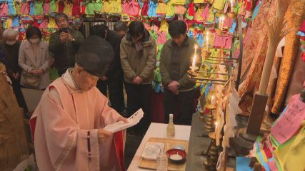 一年に一度オシラサマに願いが届くよう祈願するオシラサマ祈願祭がきょう、伝承園で開かれました。旧暦の1月16日は「オシラサマ」を出し、新しい布を着せて「おしらあそび」をする日と言われていて、伝承園では毎年この時期にオシラサマ祈願祭を開催しています。きょうは県内外からの観光客およそ20人が参加し、はじめに語り部によるオシラサマの由来や昔話の語りが行われました。続いて神事が行われオシラ堂にまつられているおよそ1,000体のオシラサマにみんなの願いが届くよう祈願しました。神事では参加した人たちも玉串をささげ、それぞれの願いが叶うよう真剣な表情で手を合わせていました。伝承園の齊藤和也支配人は、「これをきっかけに全国の人にオシラサマや遠野の魅力を知ってもらい、ぜひ遠野に足を運んでほしい」と話していました。